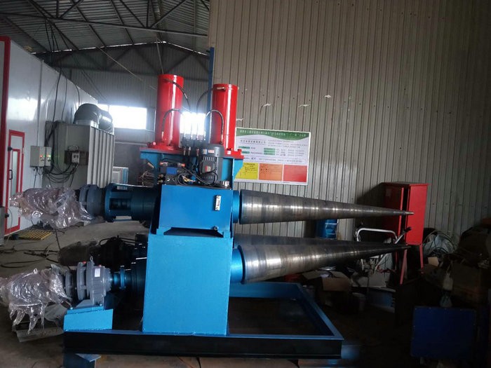 锥形草莓视频APP下载安装卷板进程与进程主要有以下三步,先将工件送进辊式草莓视频APP下载安装的作业辊内,一个辊在工件的上方,称为上辊,两个在工件下方,称为下辊,这是三辊草莓视频APP下载安装;四辊草莓视频APP下载安装有三个辊在工件的下方,一个在上辊的同一铅垂面内,称为中下辊,另两个在上辊的两边,称为侧辊,上辊可与侧辊和中下辊中恣意两个辊对工件进行曲折。